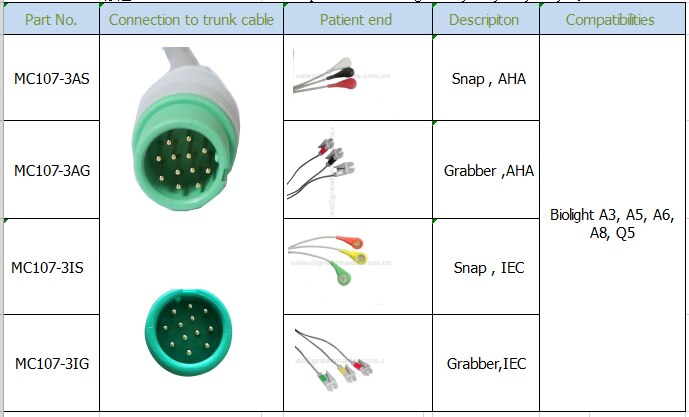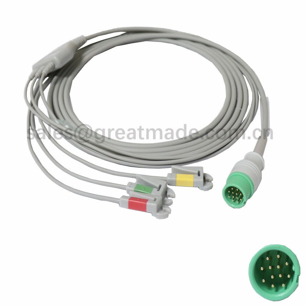 Leadwiresie와 호환되는 Biolight A3, A5, A6, A8, Q5 ECG 케이블. IEC, 3 리드, 그래버, 녹색 12 핀